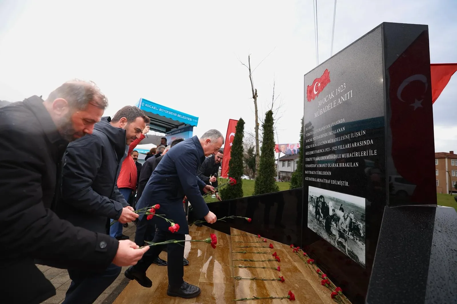 Törenin sonunda Başkan Büyükakın ve beraberindekiler, mübadele döneminde hayatını kaybedenler için anıta karanfil bıraktı.