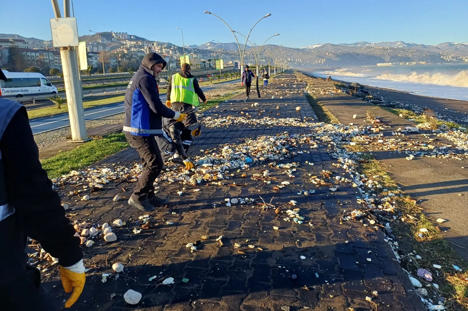Yoğun dalgaların etkisiyle denizin taşması sonucu Ayasofya sahil yolunda çeşitli atıklar ve birikintiler meydana geldi. Trabzon Büyükşehir Belediyesi Çevre Koruma ve Kontrol Dairesi Başkanlığı ekipleri, sabahın erken saatlerinde yıkama, süpürge ve mıntıka ekipleriyle birlikte kapsamlı bir temizlik çalışması başlattı.